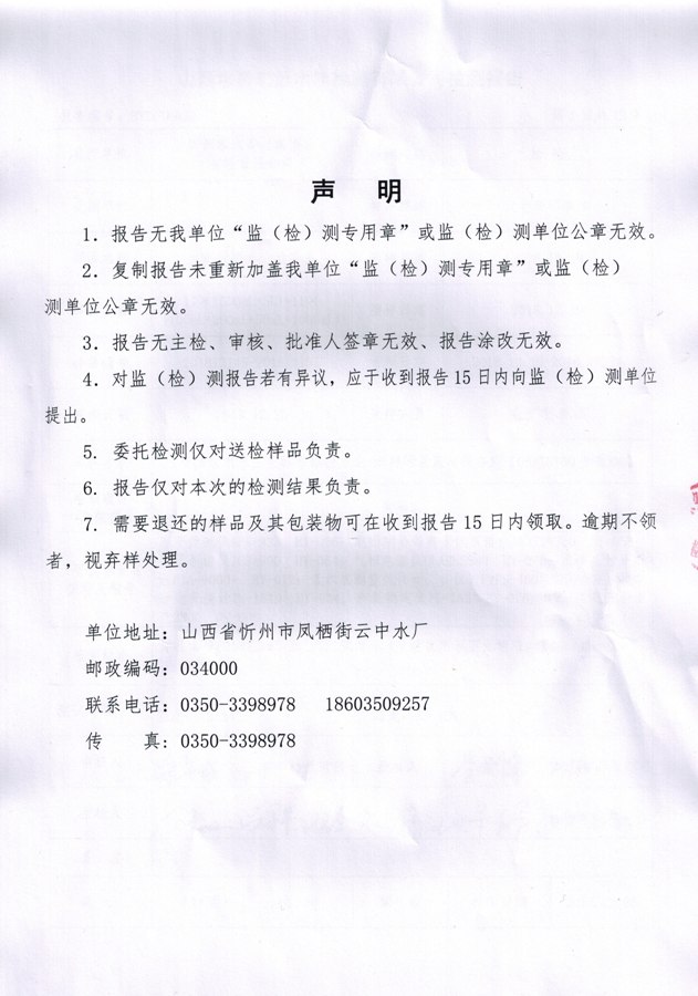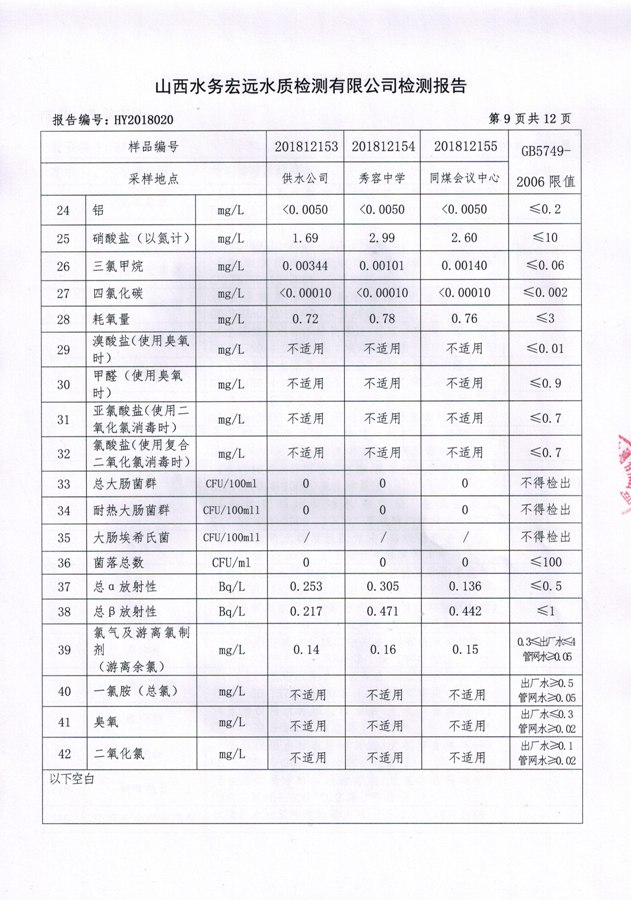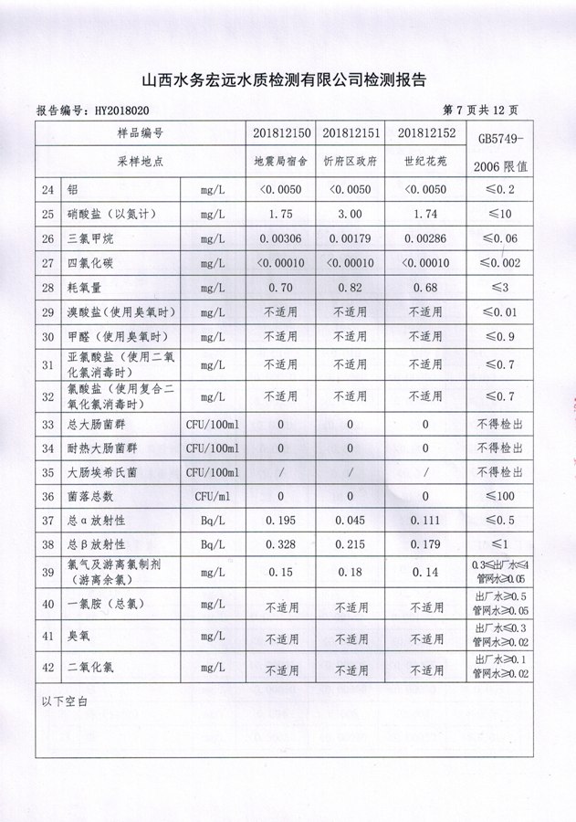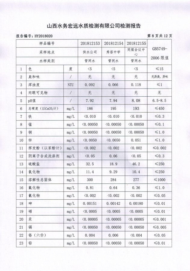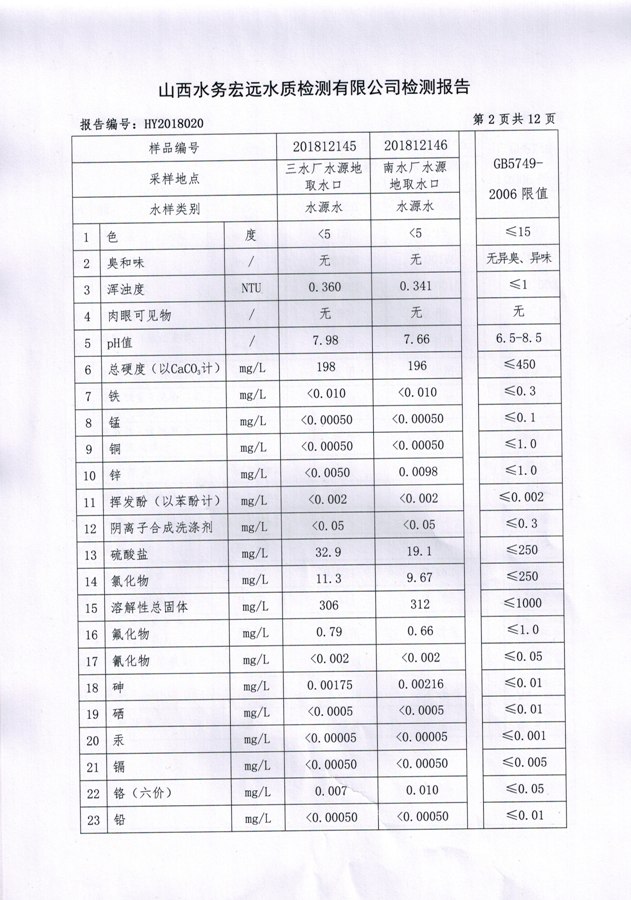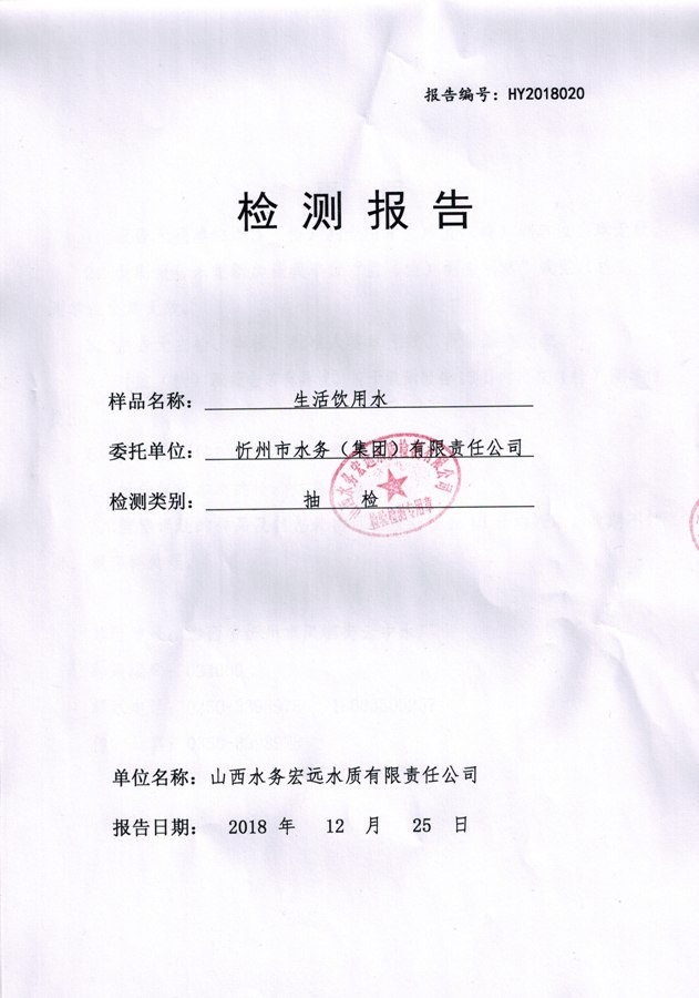 忻州城區(qū)公共供水水源水、出廠水、管網(wǎng)水、管網(wǎng)末梢水2018年12月份水質(zhì)信息公示