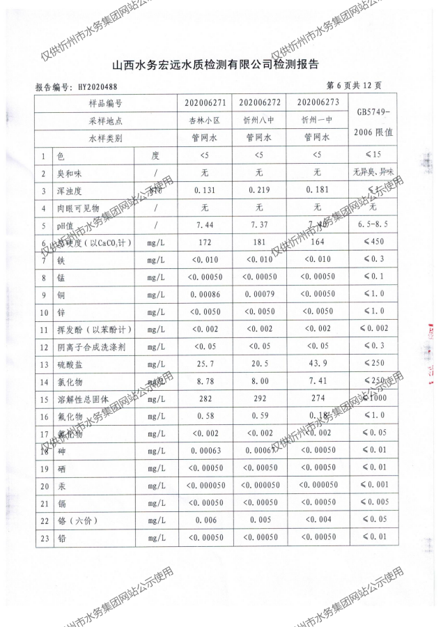 忻州城區(qū)公共供水水源水、出廠水、管網(wǎng)水、管網(wǎng)末梢水2020年7月份水質(zhì)信息公示