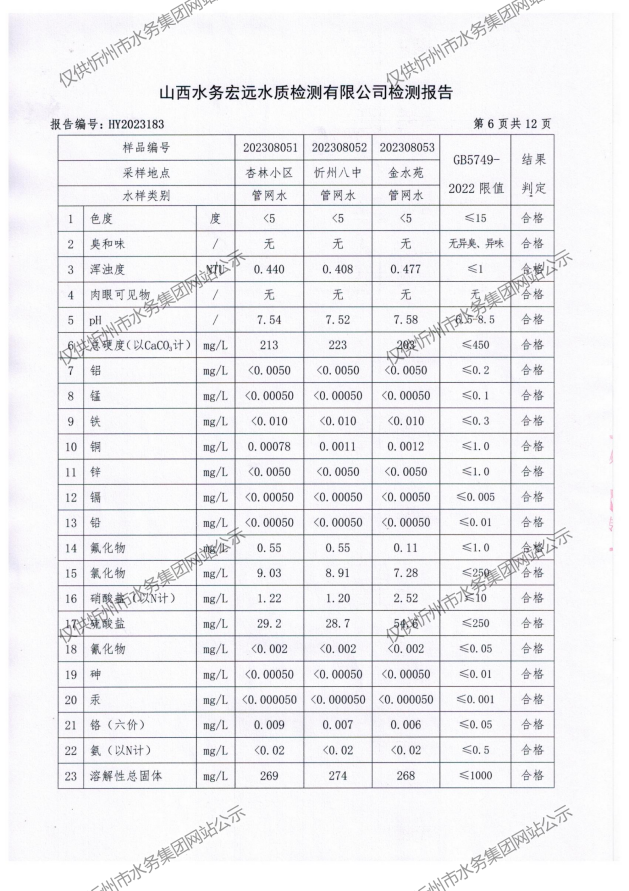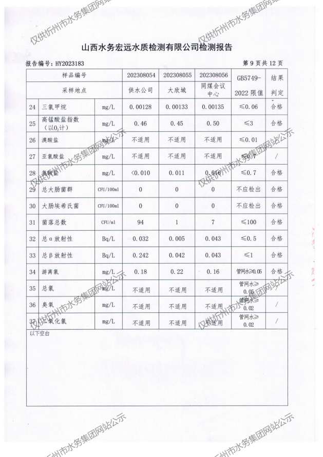 忻州城區(qū)公共供水水源水、出廠水、管網(wǎng)水、管網(wǎng)末梢水2023年8月份水質(zhì)信息公示