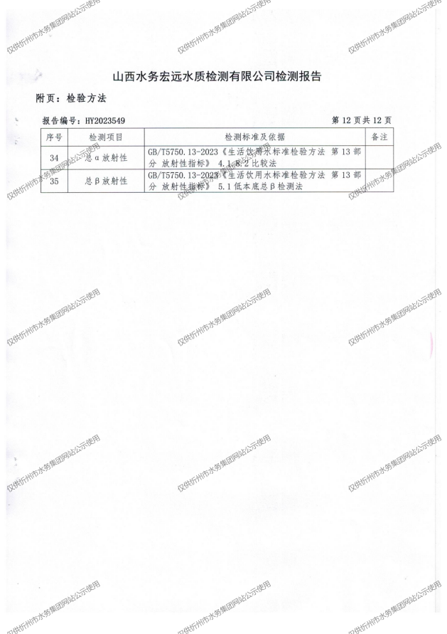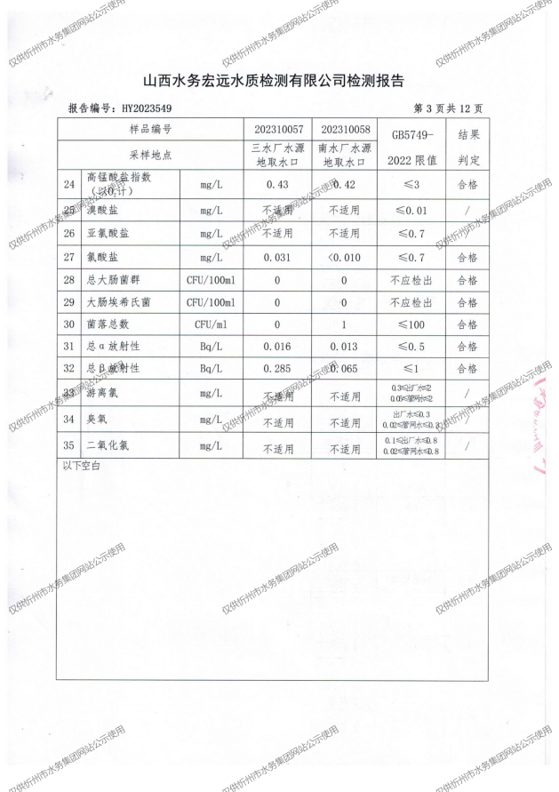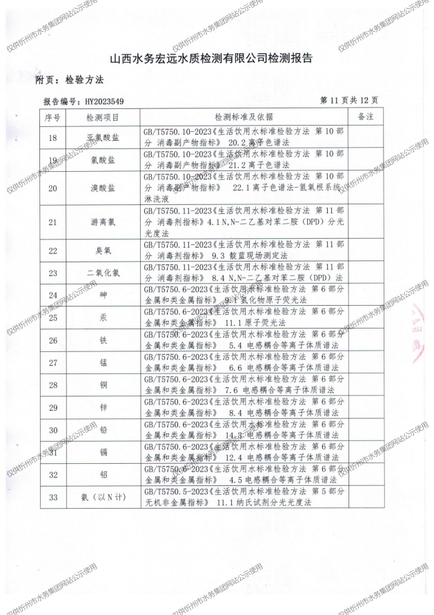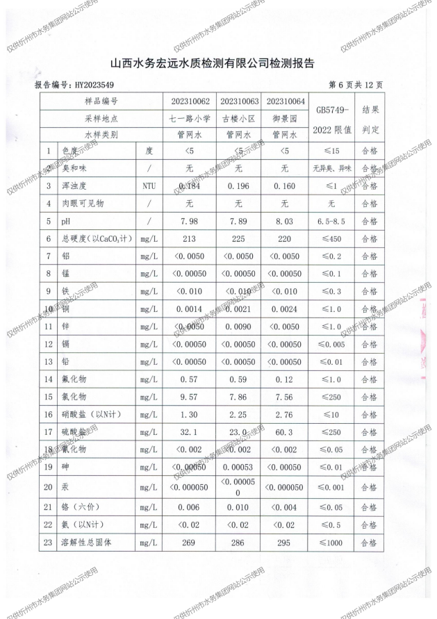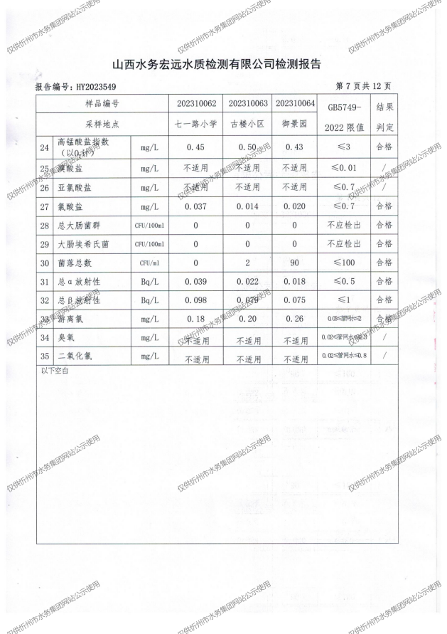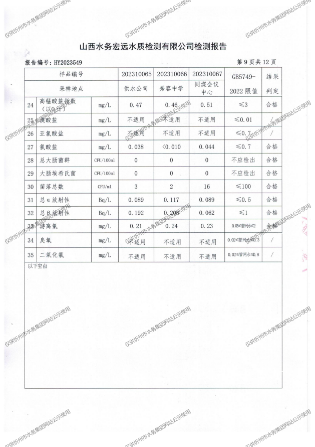 忻州城區(qū)公共供水水源水、出廠水、管網(wǎng)水、管網(wǎng)末梢水2023年10月份水質(zhì)信息公示